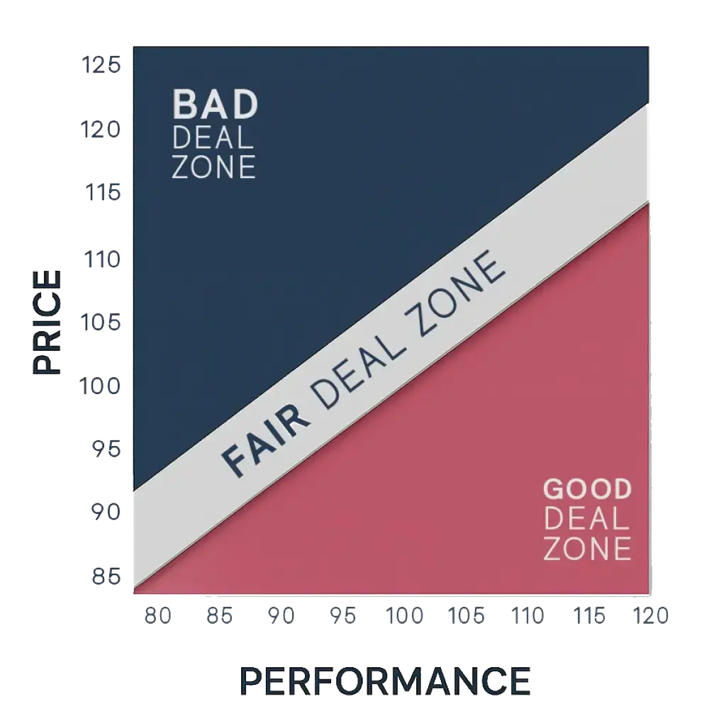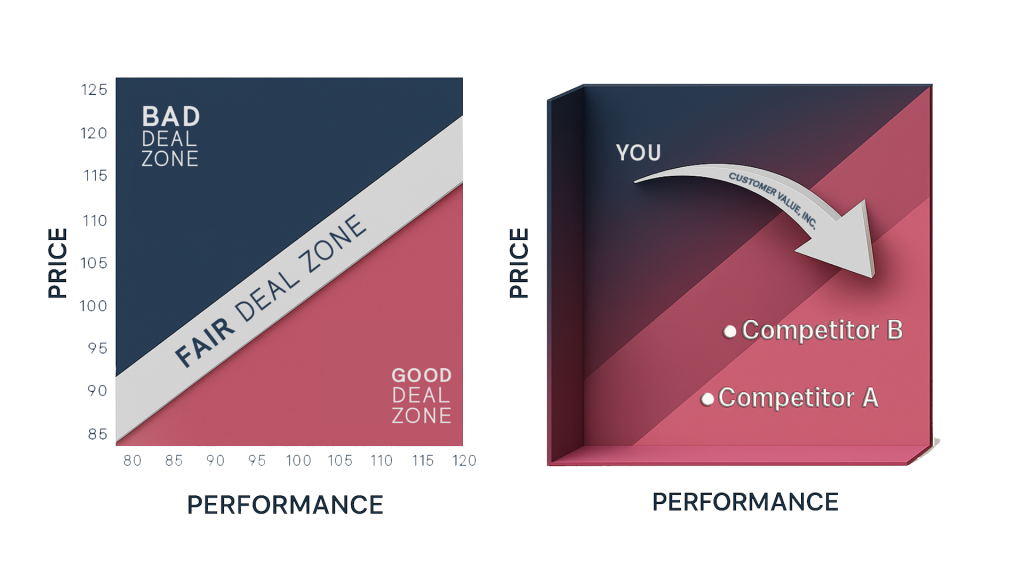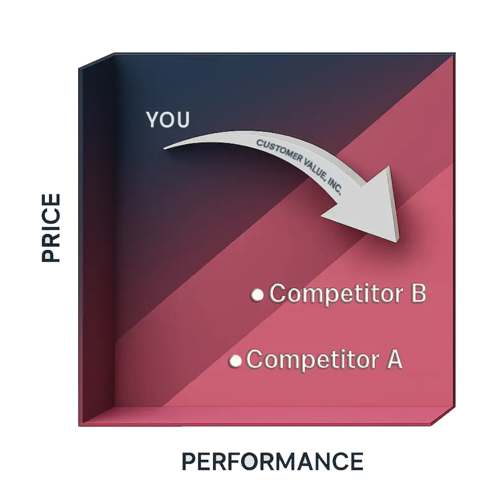 Scientifically map your perceived Performance vs. Price against competitors a clear Value Map that shows your objective market position