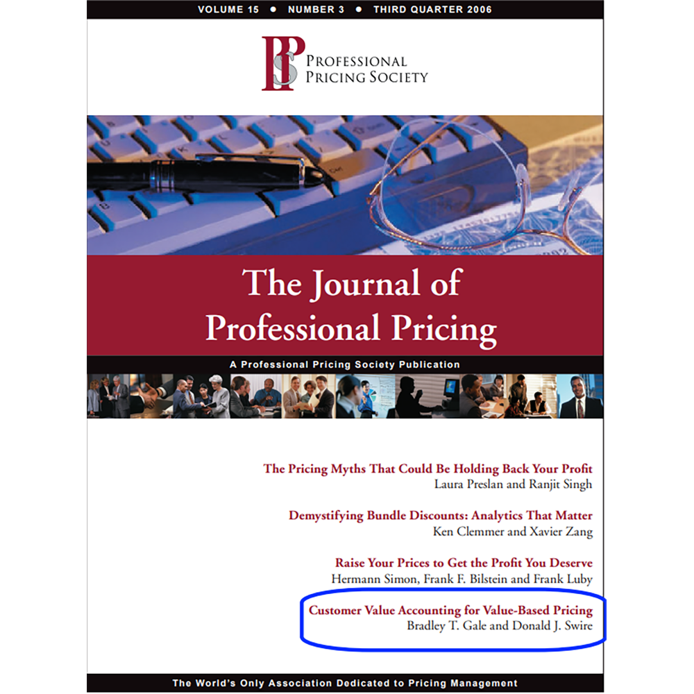 Customer Value Accounting for Value-Based Pricing, by Bradley T. Gale and Donald J. Swire, Journal of Professional Pricing, Third Quarter, 2006. You can estimate the comparative worth of your products by comparing them to the competition in terms of the customers’ costs in using the product (energy and filter costs) and other, non-cost elements of performance (quiet, easy to use, removes dust and smoke).